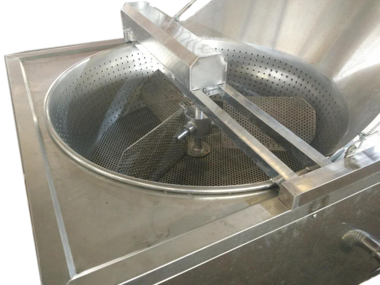 主要用于豆腐泡的炸制作業(yè)。本機(jī)使用油水比重分離原理,油泡炸制作過程中產(chǎn)生的碎渣從上層的油中沉入下層水中。